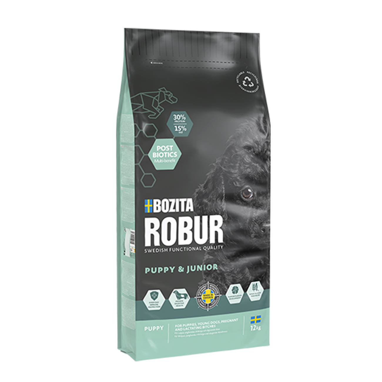 Bozita Robur Puppy & Junior er et komplett fôr for valper, unghunder, drektige og diegivende tisper.